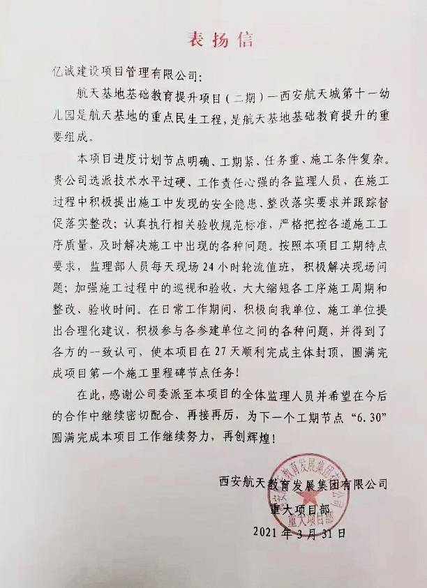 為表彰先進(jìn)、交流經(jīng)驗(yàn)、切實(shí)加強(qiáng)與各單位的良好合作關(guān)系,3月23日,陜西省西咸新區(qū)空港新城安居置業(yè)有限公司(以下簡(jiǎn)稱:空港安居置業(yè))對(duì)合作單位進(jìn)行了表彰,億誠(chéng)建設(shè)項(xiàng)目管理有限公司被授予“優(yōu)秀造價(jià)咨詢單位”。